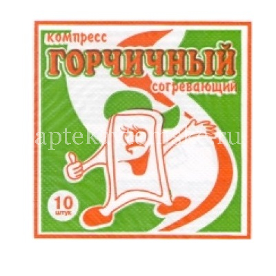 Компресс горчичный согревающий представляет собой горчичный порошок 2-го сорта, запакованный термосвариванием в четыре контурные ячейки из бумаги фильтровальной пористой неразмокаемой и материала комбинированного на бумажной основе.