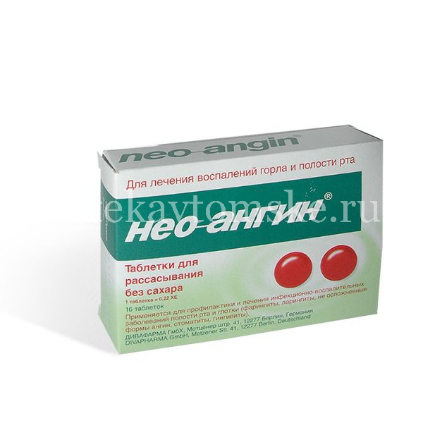 В 1 табл. нео-ангина Н содержится 1, 14 г глюкозы и 1, 42 г сахарозы (нео-ангин Н, таблетки без сахара содержат заменитель сахара — жидкий мальтитол — 2, 58 г). Это должно учитываться при назначении препарата больным сахарным диабетом.