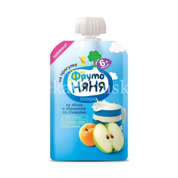 Пюре ФрутоНяня Яблоко и абрикос со сливками делается из зеленых яблок, что снижает риск развития пищевой аллергии. Органические кислоты, поступающие в организм ребенка вместе с легким яблочным пюре, имеют особое значение для детей первого года жизни. Пектин, содержащийся в яблоках, положительно влияет на деятельность желудочно-кишечного тракта, способствуя процессу пищеварения. Абрикосы содержат много сахара, каротина, тиамина, рибофлавина, никотиновую кислоту, провитамин А, витамины В1, В2, РР, С. Из минеральных веществ - калий, кальций, магний, натрий, серу, кремний, фосфор, йод, железо, медь, цинк, пектиновые вещества, а также лимонную, винную и яблочную кислоты.