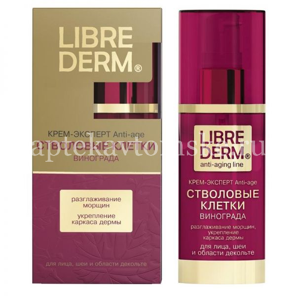 Для омоложения кожи лица и шеи лабораторией LIBREDERM разработан крем-эксперт Anti-age , в состав которого входит инновационный активный ингредиент — стволовые клетки винограда, которые действуют в течение 6 часов после нанесения крема, защищая кожу от воздействия свободных радикалов и оказывая сильный антивозрастной эффект.