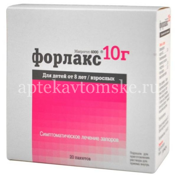 Форлакс (пакетики по 10 г — только для взрослых). Взрослым — по 1–2 пакетика (по 10 г макрогола) в сутки (предпочтительно — за один прием, утром).