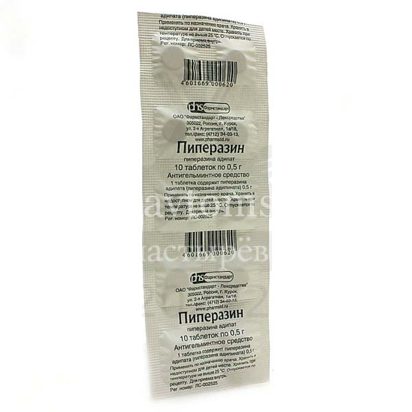 1 таблетка содержит пиперазина адипината 0, 5 г в контурной безъячейковой упаковке 6 или 10 шт.