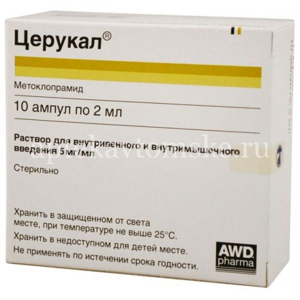 Капельную инфузию проводят кратковременно в течение 15 мин после предварительного разведения дозы препарата Церукал в 50 мл инфузионного раствора.