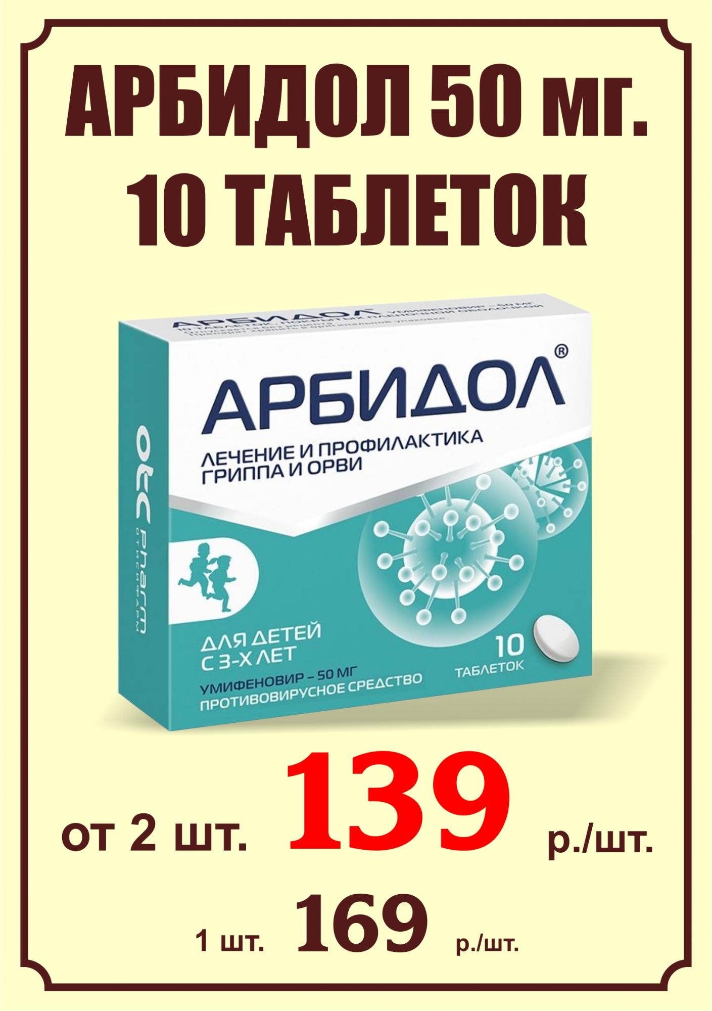 При покупке 2 и более упаковок Арбидол 50мг. №10 ЦЕНА ЗА УПАКОВКУ СОСТАВИТ 139 РУБЛЕЙ.